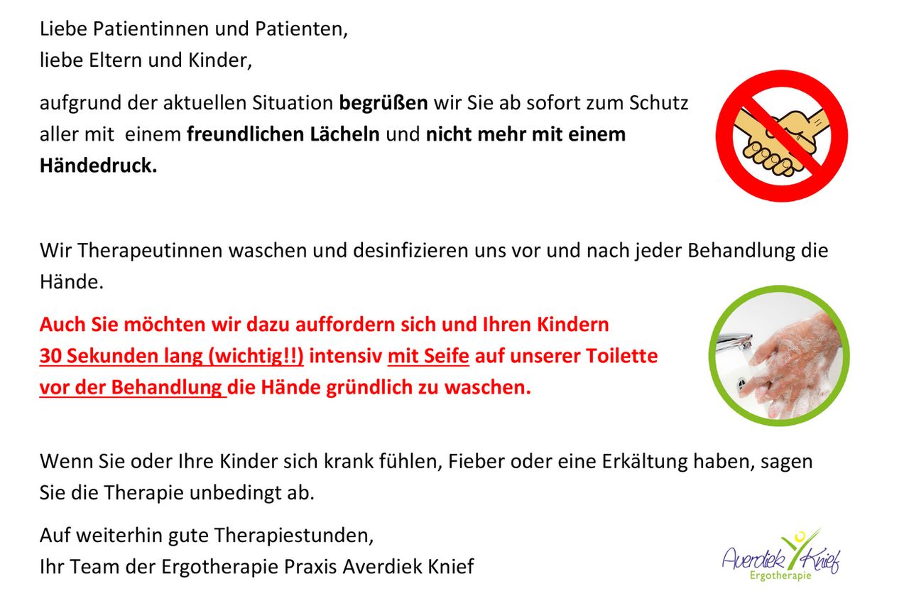 Jeder Klient kann trotzdem in die ergotherapeutische Praxis zur Therapie kommen, insofern er keine Symptome zeigt oder Kontakt zu einem gesichert Infizierten hatte (außer Sie haben die Freigabe vom zuständigen Amt). In der Therapie haben Sie ausschließlich Kontakt zur Therapeutin, die sich entsprechend der Hygienerichtlinien und dem Infektionsschutz verhält.